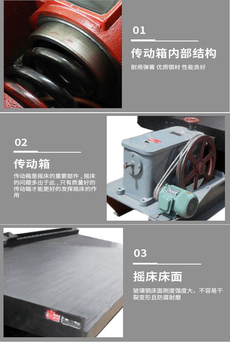 選礦搖床,是分選細粒礦石的常用設(shè)備。通常是由床面、機架和傳動機構(gòu)三大部分組成。除此之外還有沖水槽,給礦槽,機座等,整個床面由機架支撐或吊起,機架上裝有調(diào)坡裝置。