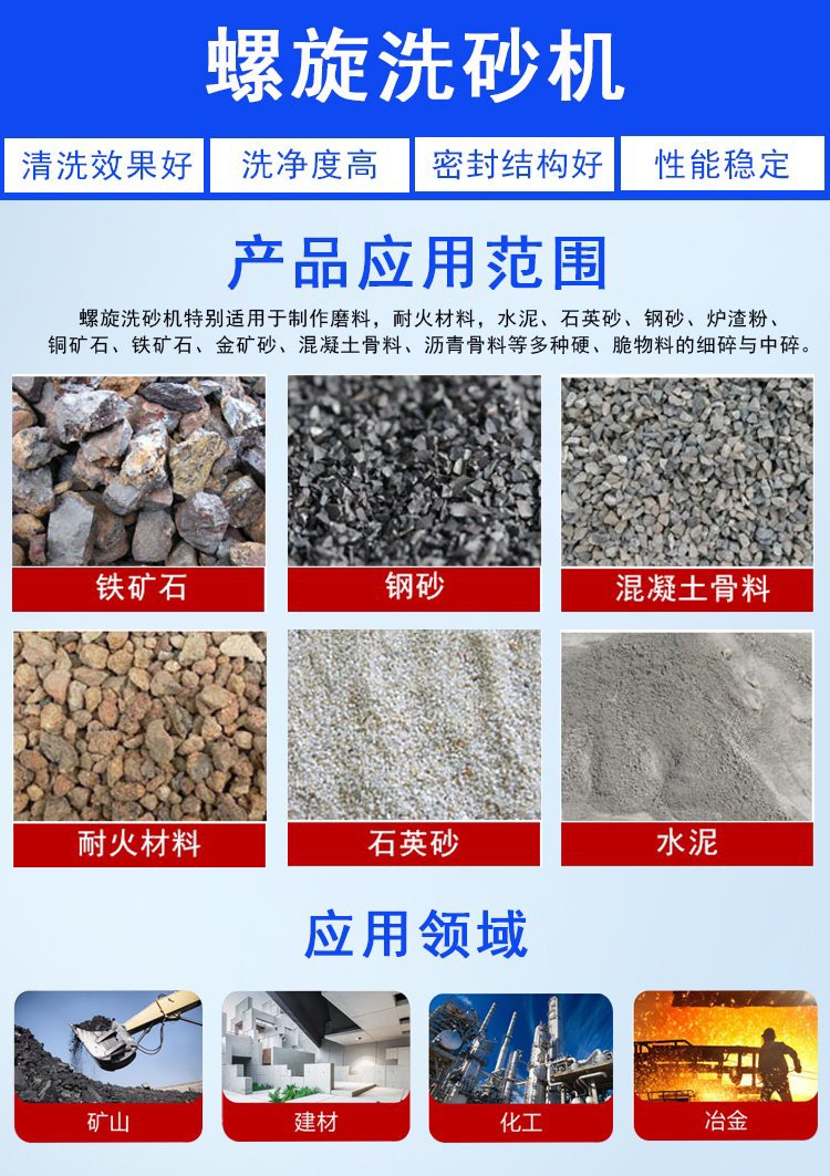 雙螺旋洗砂機處理0-30mm以內(nèi)的物料,可把物料上的泥土、灰粉,分洗成清潔的物料。本機結(jié)構(gòu)簡單,維修容易,洗選效率高等特點。槽體、減速機、電機、中心軸、螺旋葉片、支架組成。支架焊接在中心軸上,螺旋葉片安好后用螺栓壓緊,使葉片不下體變形。本機能處理0-30mm以內(nèi)的物料,可把物料上的泥土、灰粉,分洗成清潔的物料。本機結(jié)構(gòu)簡單,維修容易,洗選效率高等特點。